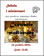 Schola działająca przy parafii oraz ministranci zapraszają wszystkich parafian na czuwanie modlitewne, które odbędzie się 24 grudnia o godz. 23:30. Już po raz drugi, będziemy mieli okazję śpiewem i muzyką wyrazić swoją radość z narodzenia Pana.