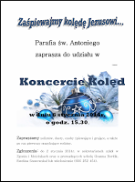 W Święto Trzech Króli, 6 stycznia 2014, w naszym kościele miał miejsce I Rodzinny Koncert Kolęd. Przez wiele lat w tym dniu odbywały się konkursy kolęd dla dzieci. Bardzo trudno było wyłonić zwycięzcę ze względu na przekrój wiekowy uczestników oraz formę prezentacji. Wiadomo, że każde dziecko chce zostać zwycięzcą i w swój występ wkłada całe serce i możliwości. Mamy nadzieję, że forma koncertu spodoba się uczestnikom i w przyszłym roku dołączą kolejne osoby i rodziny... więcej >>